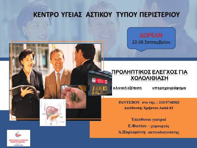 Δωρεάν κλινική εξέταση και υπερηχογράφημα για χολολιθίαση θα πραγματοποιηθεί στο πρότυπο Κέντρο Υγείας Αστικού Τύπου Περιστερίου, από Δευτέρα 22 έως Παρασκευή 26 Σεπτεμβρίου 2014.