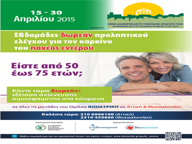 Το Εθνικό Διαδημοτικό Δίκτυο Υγιών Πόλεων – Προαγωγής Υγείας, που συμμετέχει ενεργά ο Δήμος Περιστερίου, με αφορμή το Μήνα Πρόληψης κατά του Καρκίνου του Παχέος Εντέρου (Παγκόσμιος Οργανισμός Υγείας W.H.O. – Μάρτιος 2015) διοργανώνει τις «Εβδομάδες ΔΩΡΕΑΝ προληπτικού Ελέγχου για τον Καρκίνο του Παχέος Εντέρου», πρωτοβουλία που διοργανώνεται με την επιστημονική υποστήριξη της Ελληνικής Εταιρίας Ογκολογίας Πεπτικού και με τη χορηγία των εξετάσεων από τον Όμιλο Εταιριών Υγείας ΒΙΟΪΑΤΡΙΚΗ.