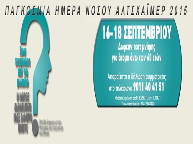 • Ενημερωτική ομιλία για τη νόσο Αλτσχάιμερ για το ευρύ κοινό Δευτέρα 21 Σεπτεμβρίου 2015 και ώρα 18:30 στο Συνεδριακό – Πολιτιστικό Κέντρο Δήμου Περιστερίου (Καραθεοδωρή & Εθνικής Αντιστάσεως), με Θέμα: « Η νόσος Aλτσχάιμερ μας αφορά όλους». Ομιλήτρια: Δρ. Π. Σακκά, νευρολόγος-ψυχίατρος, πρόεδρος του Εθνικού Παρατηρητηρίου για την άνοια – νόσο Αλτσχάιμερ.