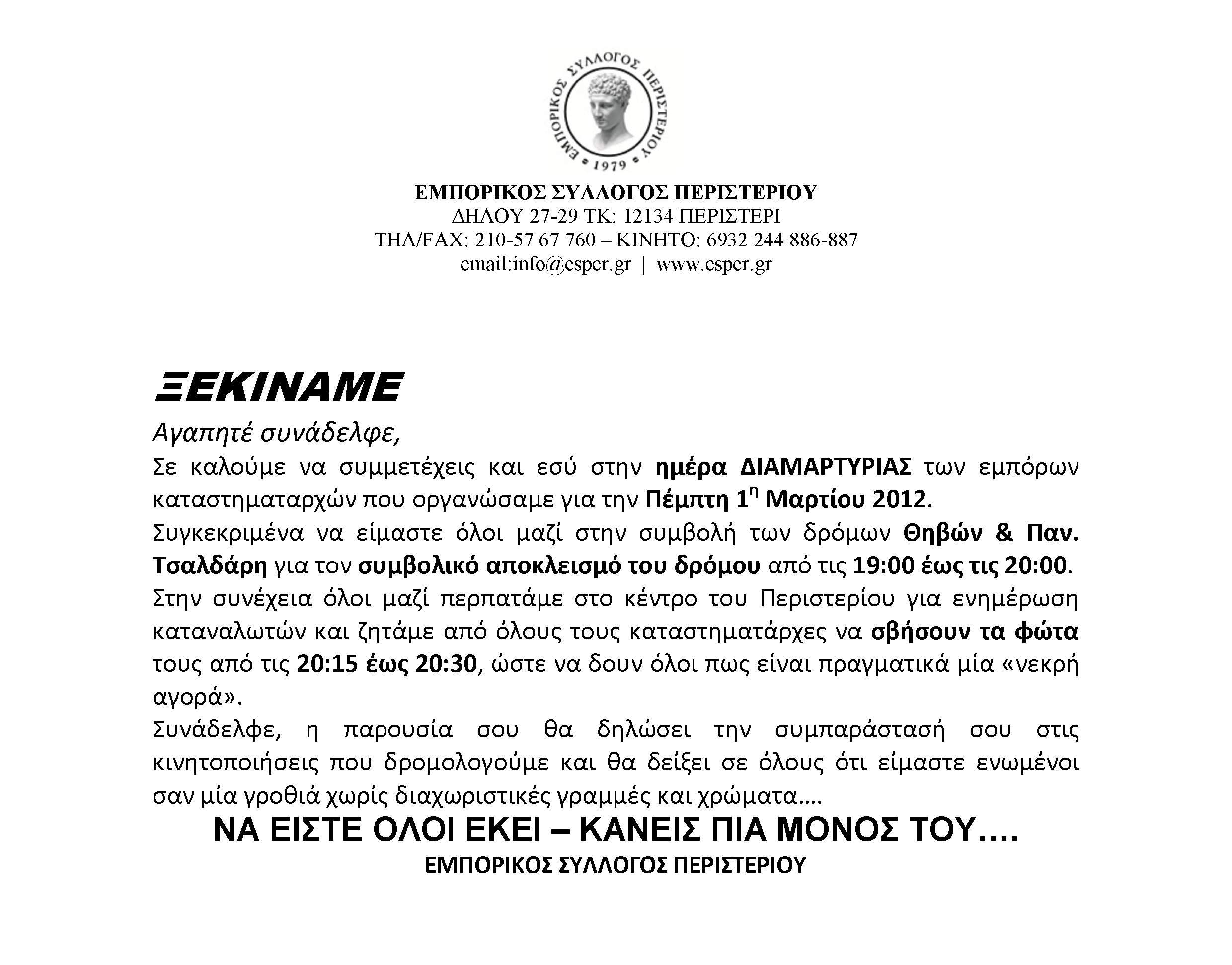 Σαν έναρξη των κινητοποιήσεων ο Εμπορικός Σύλλογος όρισε την Πέμπτη 01-03-2012 ως ημέρα διαμαρτυρίας των εμπόρων του Περιστερίου και καλεί όλους τους συναδέλφους τους να παρευρεθούν στις 19.00μ.μ. στην συμβολή των δρόμων Θηβών και Παναγή Τσαλδάρη για τον συμβολικό αποκλεισμό των δρόμων για μία ώρα.