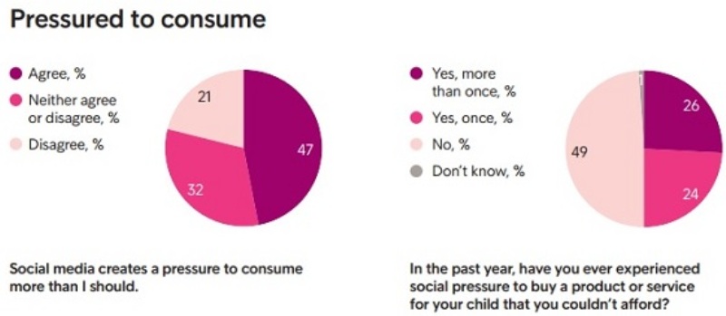 Η πίεση για την αγορά αγαθών, παρά το γεγονός ότι δεν μπορούν να τα πληρώσουν, είναι πιο μεγάλη για τους γονείς, ζήτημα το οποίο προτάσσει στη φετινή έκθεση η εταιρεία. Τέτοια πίεση από την κοινωνία δηλώνει ότι δέχεται το 50% των γονέων στην Ελλάδα όταν ο ευρωπαϊκός μ.ο. είναι 33%.