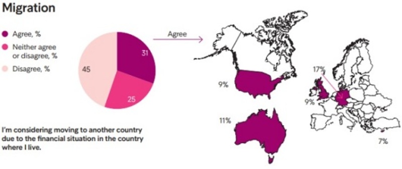 Στην Ελλάδα επίσης συναντάται το υψηλότερο ποσοστό των γονέων, 43%, που δηλώνουν ότι τα παιδιά τους θα ζήσουν σε χειρότερη οικονομική κατάσταση απ’ ότι οι ίδιοι. Γι αυτό και δεν είναι τυχαίο πως η χώρα μας παρουσιάζει το δεύτερο μεγαλύτερο ποσοστό, 31%, πίσω από την Ουγγαρία, 33%, με ανθρώπους που δηλώνουν ότι σκέφτονται να μεταναστεύσουν σε άλλη χώρα λόγω της κακής οικονομικής κατάστασης.