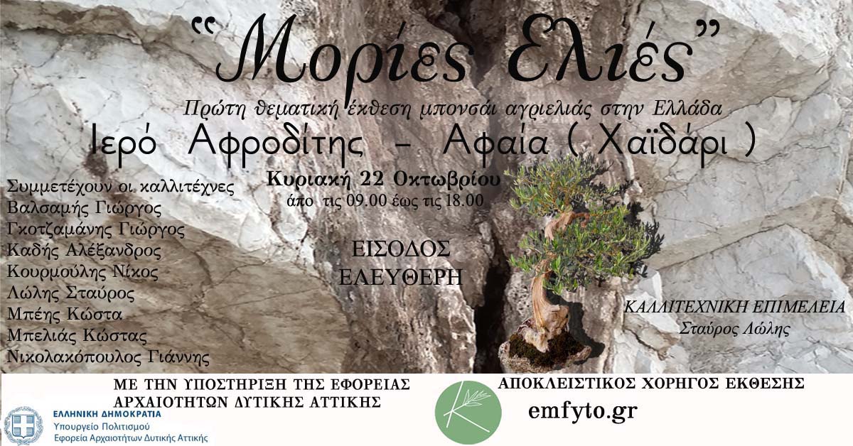 Η έκθεση αποτελεί αφιέρωμα στις Μορίες Ελιές της Αρχαίας Αθήνας μέσω της αρχέγονης τέχνης των μπονσάι.