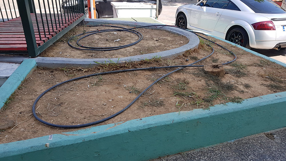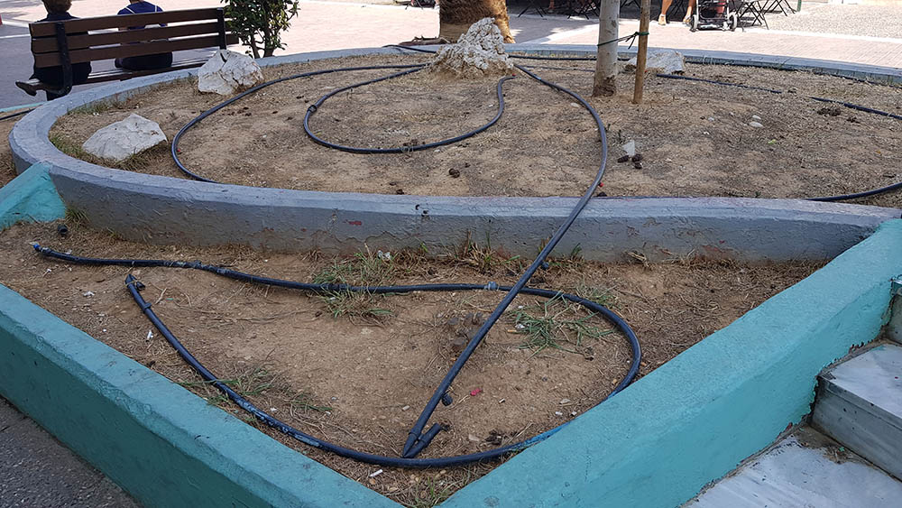 Οι δυο παρακάτω εικόνες τραβήχτηκαν το Σάββατο που μας πέρασε και προέρχονται από ένα σημείο που όλοι οι Περιστεριώτες γνωρίζουν εδώ και πολλά χρόνια στον πεζόδρομο. Όπως μπορείτε να δείτε απορρίμματα, ακαθαρσίες ζώων και πλαστικά καλώδια ποτίζουν το ξερό χώμα του παρτεριού που κάποτε ήταν σιντριβάνι.