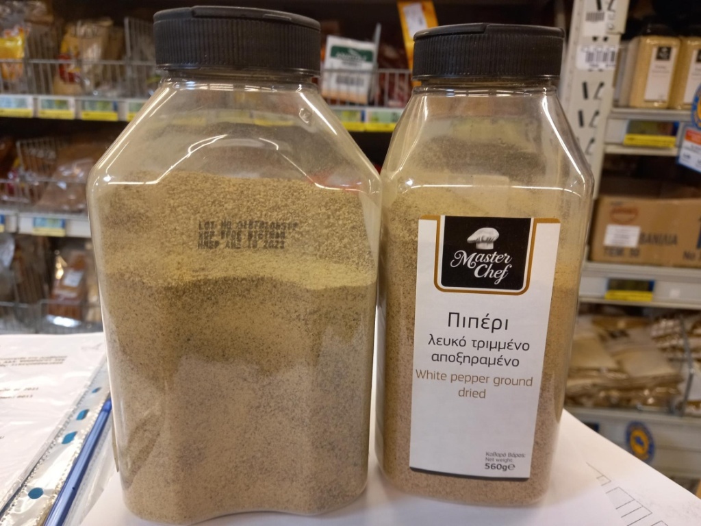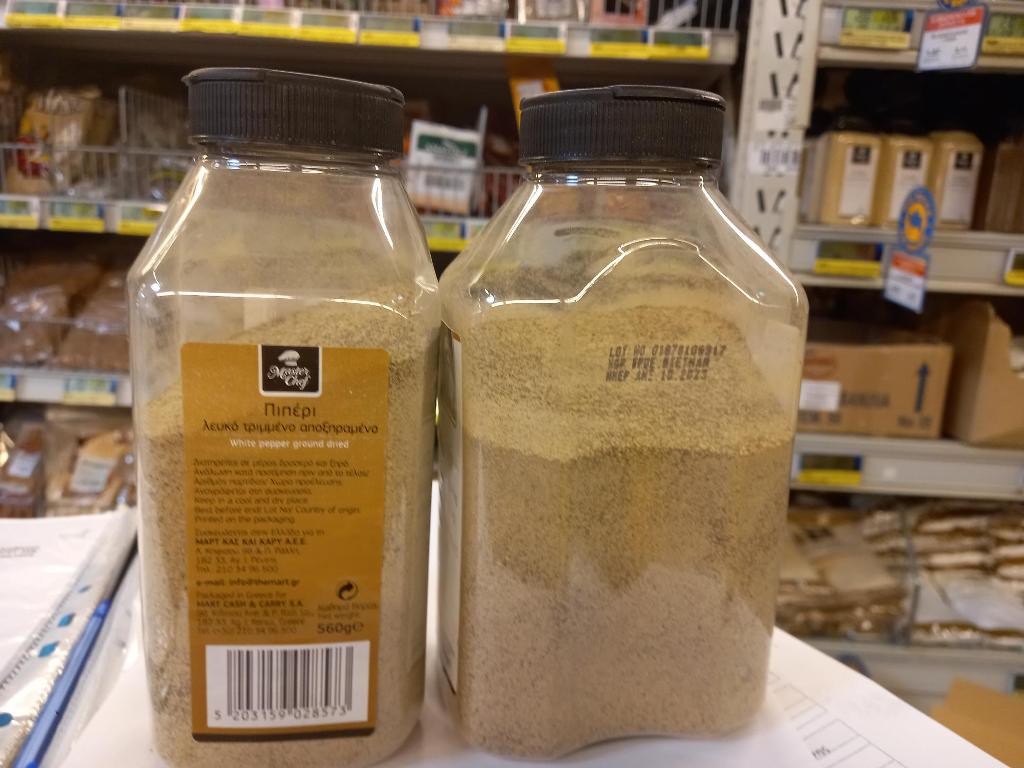 Συγκεκριμένα, πρόκειται για το προϊόν «πιπέρι λευκό τριμμένο αποξηραμένο» με την εμπορική ονομασία «Master Chef» σε πλαστική κλειστή συσκευασία 560 γρ, με αριθμό παρτίδας 01878106317 και ανάλωση κατά προτίμηση πριν από: 10/2023, το οποίο συσκευάζεται στην Ελλάδα για την ΜΑΡΤ ΚΑΣ και ΚΑΡΥ Α.Ε.Ε., Λ. Κηφισού 98 και Π. Ράλλη, ΤΚ 18233, Αγ. Ι. Ρέντης, από την ΒΑΣΙΛΕΙΟΣ ΔΙΑΜΑΝΤΟΠΟΥΛΟΣ Α.Β.Ε. «ΗΛΙΟΣ ΜΠΑΧΑΡΙΚΑ», Αγ. Ι. Ρέντη 157 και Αιτωλοακαρνανίας 1, ΤΚ 18541 Πειραιάς.