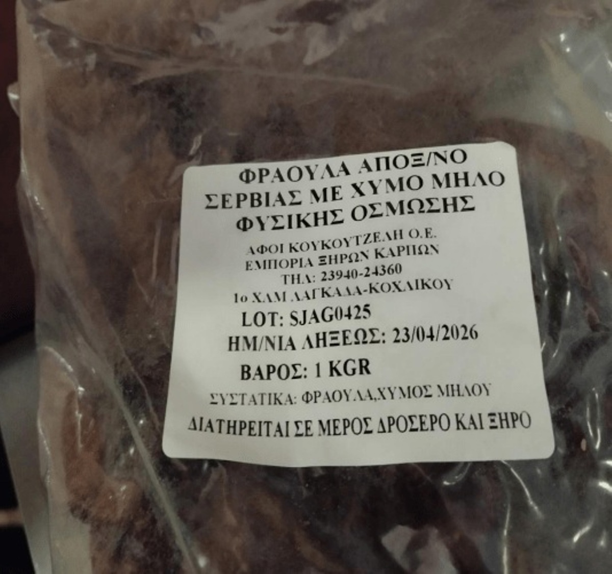 Πρόκειται για το προϊόν «Φράουλα αποξηραμένη με χυμό μήλου φυσικής όσμωσης», σε πλαστική συσκευασία του 1 κιλού, με αριθμό παρτίδας SJAG0425 και ανάλωση κατά προτίμηση πριν από τις 23/04/2026, προέλευσης Σερβίας. Το προϊόν διατίθεται στην Ελλάδα από την επιχείρηση «ΑΦΟΙ ΚΟΥΚΟΥΤΖΕΛΗ Ο.Ε.», με έδρα στον 1ο χλμ Λαγκαδά–Κολχικού.