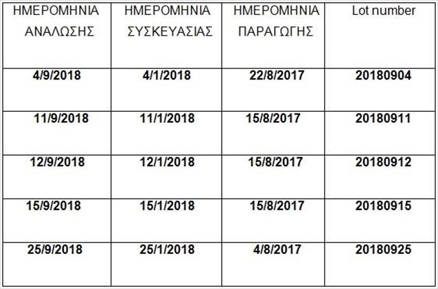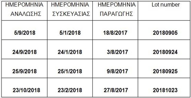 Καλούνται οι καταναλωτές, που έχουν ήδη προμηθευτεί προϊόντα των παρτίδων των ανωτέρω προϊόντων, να μην τα καταναλώσουν.