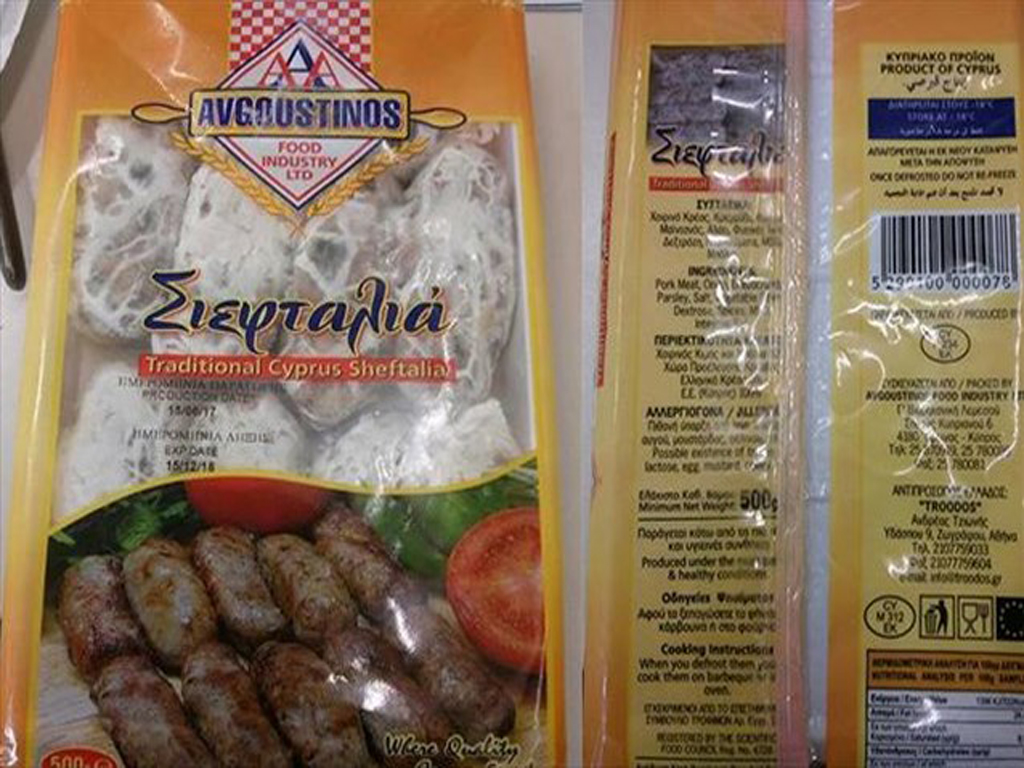 Συγκεκριμένα, πρόκειται για το κατεψυγμένο προϊόν με την εμπορική ονομασία «AVGOUSTINOS Σιεφταλιά – Traditional Cyprus Sheftalia», σε συσκευασία 500g, με ημερομηνία παραγωγής: 15.06.17 και ημερομηνία λήξης: 15.12.2018. Το ανωτέρω προϊόν παράγεται και συσκευάζεται από την επιχείρηση «ΑVGOUSTINOS FOOD INDUSTRY LTD», Κύπρος.
