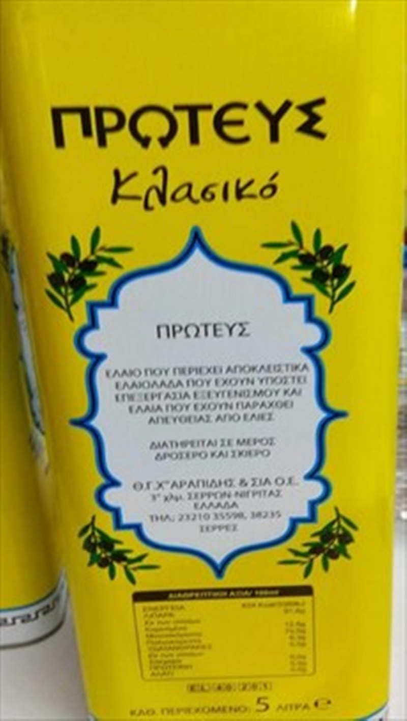 Πρόκειται για το ελαιόλαδο, αποτελούμενο από εξευγενισμένα ελαιόλαδα και παρθένα ελαιόλαδα, με την εμπορική ονομασία «ΠΡΩΤΕΥΣ Κλασικό», σε μεταλλική συσκευασία των 5 λίτρων, με ημερομηνία παραγωγής 01-03-2018, LOT 12/11013/206 και ανάλωση κατά προτίμηση πριν από 01-09-2019, το οποίο τυποποιείται από την επιχείρηση «Θ. Γ. ΧΑΤΖΗΑΡΑΠΙΔΗΣ ΚΑΙ ΣΙΑ Ο.Ε.», 3ο χλμ Σερρών-Νιγρίτας, με αλφαριθμητικό αριθμό μονάδας τυποποίησης EL 40201.