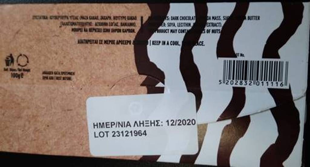 Πρόκειται για το προϊόν “Σοκολάτα υγείας ΠΟΛΥΧΩΡΟΣ ΓΕΥΣΕΩΝ ΧΡΥΣΟ” σε συσκευασία 100g, με ημερομηνία ελάχιστης διατηρησιμότητας 12-2020.