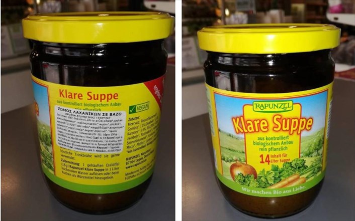 Συγκεκριμένα, ο ΕΦΕΤ ενημερώθηκε, για τη διακίνηση ζωμού λαχανικών σε σκόνη, το οποίο ενδέχεται να περιέχει ξένο σώμα (θραύσματα γυαλιού). Συγκεκριμένα, πρόκειται για το προϊόν «Klare Suppe» με εμπορική ονομασία «Rapunzel», γερμανικής προέλευσης, σε γυάλινο βάζο των 250 γρ., με αριθμό γραμμοκώδικα ΕΑΝ 4006040271017 και ημερομηνία ανάλωσης κατά προτίμηση πριν από 18.09.2020.