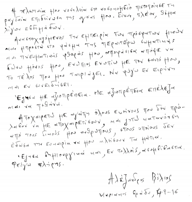 Το κείμενό του με τίτλο το αντίο μου καταλήγει: «Εζησα δημιουργικά και, εν πολλοίς, ασυμβίβαστα. Φεύγω πλήρης».