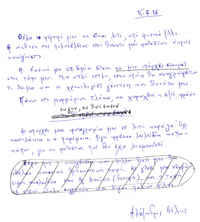 Στο βίντεο που ακολουθεί λίγο πριν πεθάνει ο Αλέξανδρος Βέλιος με ένα ιδιόχειρο σημείωμα διαβασμένο (ηχητικό) από τον ίδιο εξηγεί πώς κατέφυγε στη λύση της μη υποβοηθούμενης ευθανασίας.