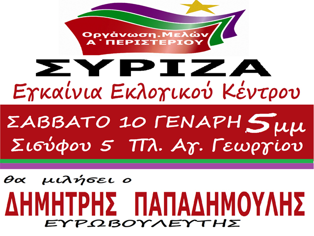 Η οργάνωση μελών ΣΥΡΙΖΑ Α΄ΠΕΡΙΣΤΕΡΙΟΥ καλεί το Σάββατο 10 Γενάρη στις 5 μ.μ, στα εγκαίνια του εκλογικού κέντρου του ΣΥΡΙΖΑ στην οδό Σισύφου 5 στην πλατεία Αγίου Γεωργίου.