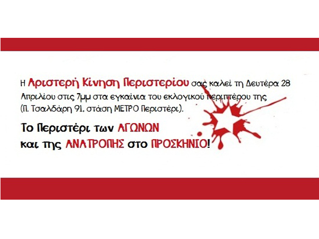 Η Αριστερή Κίνηση Περιστερίου σας καλεί τη Δευτέρα 28 Απριλίου στις 7.00 μμ στα εγκαίνια του εκλογικού περιπτέρου της (Π. Τσαλδάρη 91, στάση ΜΕΤΡΟ Περιστέρι).