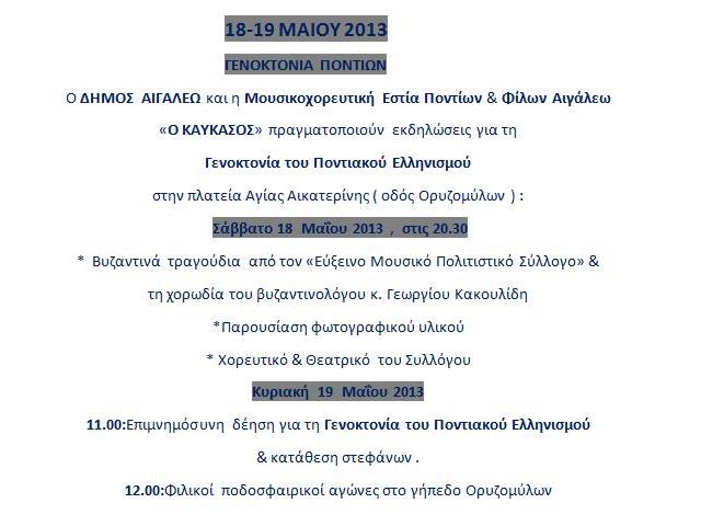 Ο Δήμος Αιγάλεω σας προσκαλεί στις 18 και 19 Μαΐου στις εκδηλώσεις για τη Γενοκτονία του Ποντιακού Ελληνισμού που συνδιοργανώνει με τη Μουσικοχορευτική Εστία Ποντίων & Φίλων Αιγάλεω «O ΚΑΥΚΑΣΟΣ».