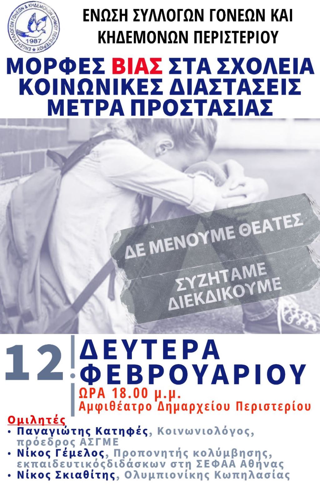Η Ένωση Συλλόγων Γονέων και Κηδεμόνων Περιστερίου διοργανώνει εκδήλωση, τη Δευτέρα 12 Φεβρουαρίου 2024 στις 18:00, στο αμφιθέατρο του Δημαρχείου Περιστερίου (στάση Μετρό Περιστέρι).