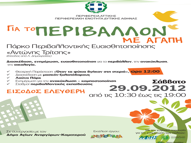 Η Περιφέρεια Αττικής – Περιφερειακή Ενότητα Δυτικής Αθήνας σε συνεργασία με τον Δήμο Αγίων Αναργύρων – Καματερού διοργανώνουν εκδήλωση στο Πάρκο Αντώνης Τρίτσης, το Σάββατο 29-09-2012, ώρα 10:30 π.μ. έως 19:00 με είσοδο ελεύθερη.