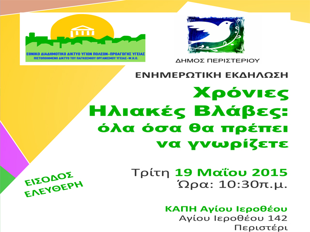 Με στόχο την προστασία από τον καρκίνο του δέρματος και την έγκαιρη διάγνωση της ακτινικής κεράτωσης, ο Δήμος Περιστερίου και το Εθνικό Διαδημοτικό Δίκτυο Υγιών Πόλεων – Προαγωγής Υγείας (ΕΔΔΥΠΠΥ) διοργανώνουν ανοιχτή ενημερωτική εκδήλωση πολιτών με θέμα: «Χρόνιες Ηλιακές Βλάβες: όλα όσα θα πρέπει να γνωρίζετε», την Τρίτη 19 Μαΐου 2015 και ώρα 10:30 το πρωί στο ΚΑΠΗ Αγίου Ιεροθέου, (Αγίου Ιεροθέου 142, Περιστέρι). Είσοδος Ελεύθερη.