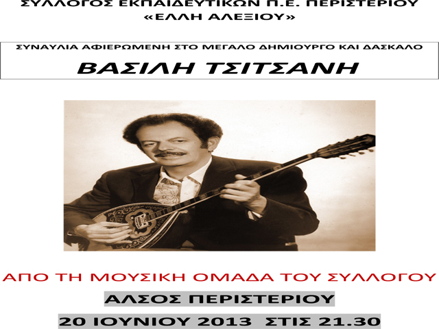 Το Δ.Σ. του Συλλόγου Εκπαιδευτικών Π. Ε. Περιστερίου «Έλλη Αλεξίου«Ε, λόγω των εξελίξεων στην ΕΡΤ και των δυσμενών καιρικών συνθηκών που επικρατούν, αναβάλλει την προγραμματισμένη για την Πέμπτη 13/6/2013 συναυλία – αφιέρωμα στον Β. Τσιτσάνη.