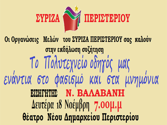 Εκδήλωση ΣΥΡΙΖΑ Περιστερίου στις 18 Νοεμβρίου