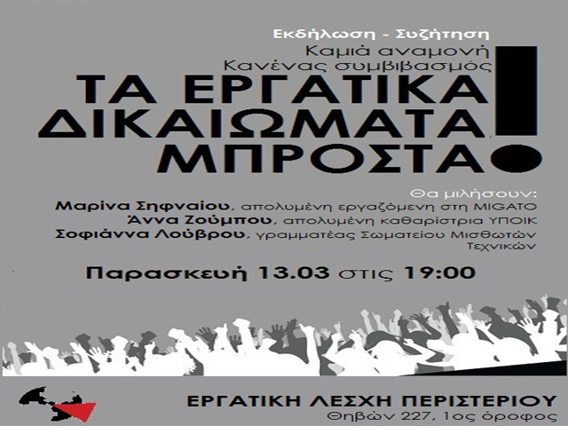 Εκδήλωση – Συζήτηση “Καμιά αναμονή – Κανένας συμβιβασμός.ΤΑ ΕΡΓΑΤΙΚΑ ΔΙΚΑΙΩΜΑΤΑ ΜΠΡΟΣΤΑ!”, την Παρασκευή 13 Μαρτίου στις 19:00 στην Θηβών 227.