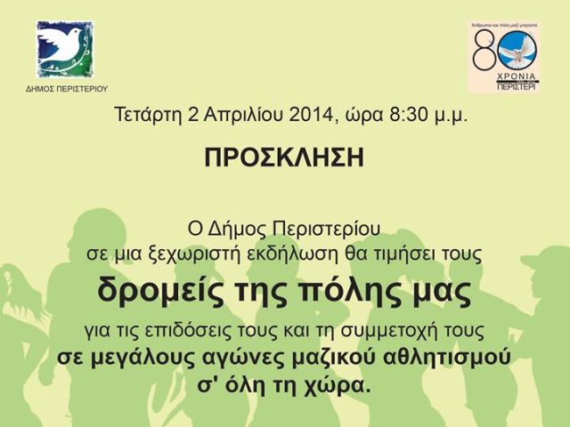 Σε μια ξεχωριστή εκδήλωση την Τετάρτη 2 Απριλίου στις 8.30 μ.μ. ο Δήμος Περιστερίου θα τιμήσει τους δρομείς της πόλης για τις επιδόσεις τους και τη συμμετοχή τους σε μεγάλους αγώνες μαζικού αθλητισμού σ’ όλη τη χώρα.