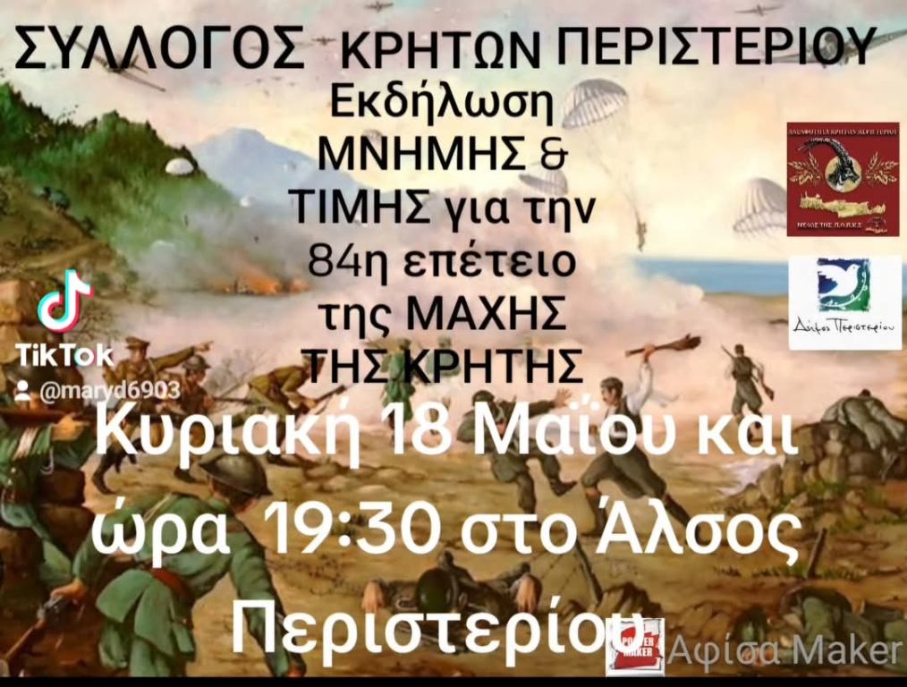 Την 84η επέτειο της Μάχης της Κρήτης θα γιορτάσει στο Περιστέρι η Αδελφότητα Κρητών της πόλης μας.