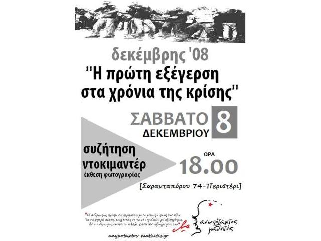 Tο Σάββατο 8/12 στις 18:00, Σαρανταπόρου 74, Περιστέρι, οι “ΑΝΥΠΟΤΑΧΤΟΙ ΜΑΘΗΤΕΣ” συζητάνε με θέμα: “Δεκέμβρης 2008: Η πρώτη εξέγερση στα χρόνια της κρίσης”.
