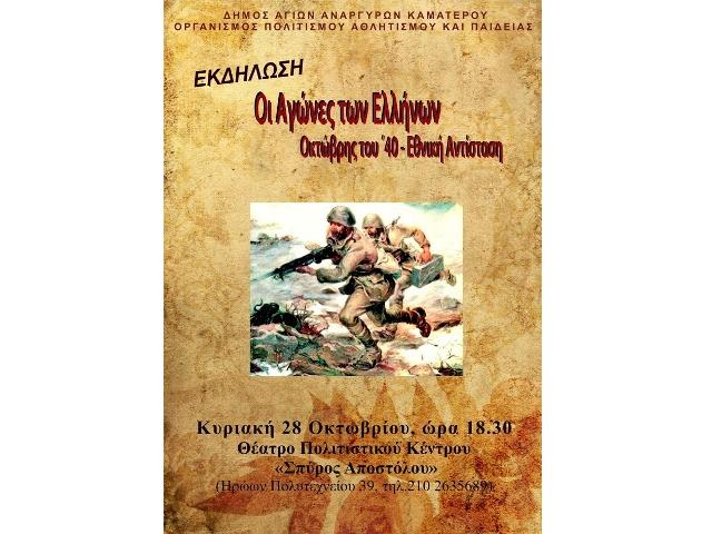 Ο Δήμος Αγίων Αναργύρων – Καματερού και ο Οργανισμός Πολιτισμού, Αθλητισμού & Παιδείας του Δήμου σας προσκαλούν στην εκδήλωση «Οι Αγώνες των Ελλήνων – Οκτώβρης του 40, Εθνική Αντίσταση».