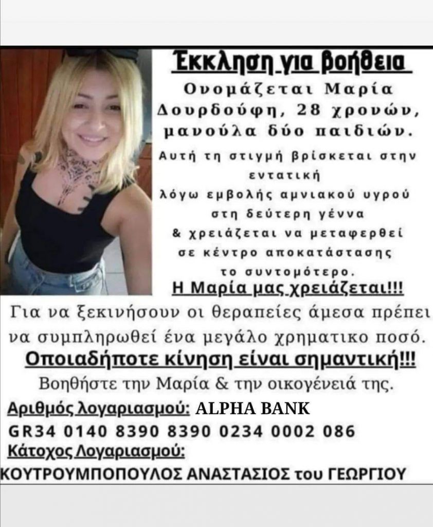 Έκκληση για βοήθεια γίνεται αυτές τις μέρες για 28χρονη μητέρα δύο παιδιών από το Περιστέρι που εδώ και τέσσερις μήνες βρίσκεται στην εντατική.