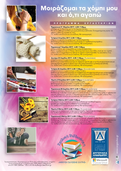 Η Άνοιξη έρχεται δυναμικά και ανθίζει στη Σχολική Βιβλιοθήκη των Εκπαιδευτηρίων Αυγουλέα-Λιναρδάτου. Η Βιβλιοθήκη των Εκπαιδευτηρίων Αυγουλέα-Λιναρδάτου καλεί το κοινό σε δημιουργικές συναντήσεις στις οποίες θα παρουσιαστούν χόμπι και δημιουργικές απασχολήσεις με χαρακτήρα καλλιτεχνικό, πρακτικό, γενικότερα δημιουργικό (κατασκευές, συλλογές, μουσική, κ.λπ.).