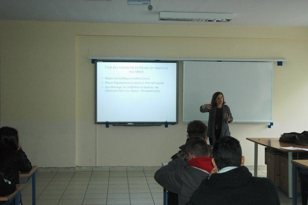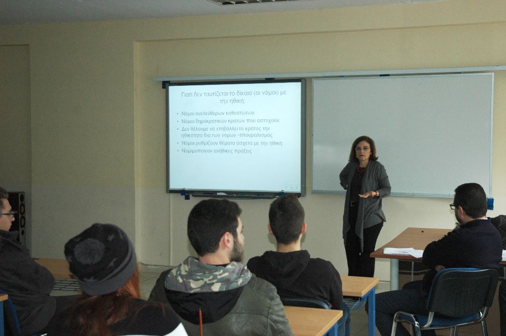 Στο πλαίσιο της υλοποίησης της πρωτοβουλίας αυτής το Λύκειο των Εκπαιδευτηρίων «ΝΕΑ ΠΑΙΔΕΙΑ» είχε την τιμή να φιλοξενήσει την Παρασκευή, 5 Φεβρουαρίου 2016, την κυρία Βασιλική Κιντή, καθηγήτρια Φιλοσοφίας της Επιστήμης στο τμήμα Μεθοδολογίας, Ιστορίας και Θεωρίας της Επιστήμης του Εθνικού Καποδιστριακού Πανεπιστημίου Αθηνών, η οποία είχε μια εποικοδομητική συζήτηση με τους μαθητές και τις μαθήτριες της Γ’ Λυκείου με θέμα: «Η Ηθική της Επιστήμης».