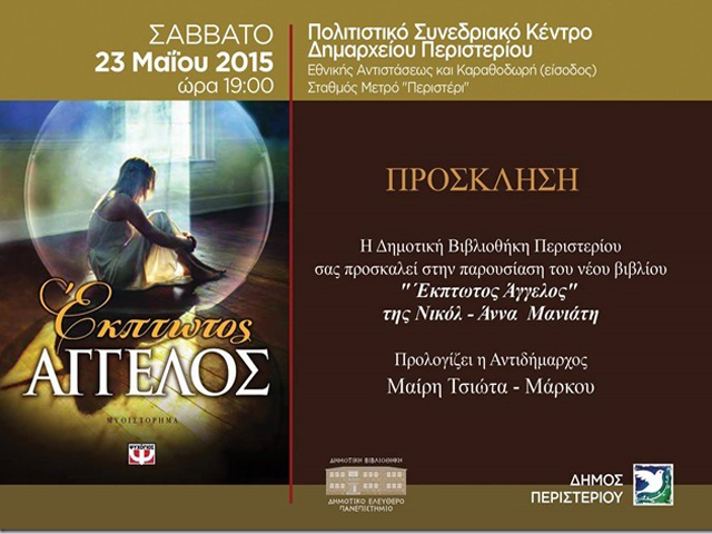 Η Δημοτική Βιβλιοθήκη Περιστερίου στα πλαίσια των δραστηριοτήτων της παρουσιάζει το νέο βιβλίο της Νικόλ-Άννα Μανιάτη με τίτλο: “Έκπτωτος Άγγελος”, το Σάββατο 23 Μαΐου 2015, ώρα 19.00 στο Πολιτιστικό – Συνεδριακό Κέντρο του Δημαρχείου (Καραθεοδωρή και Εθν. Αντιστάσεως, σταθμός Μετρό “Περιστέρι”).