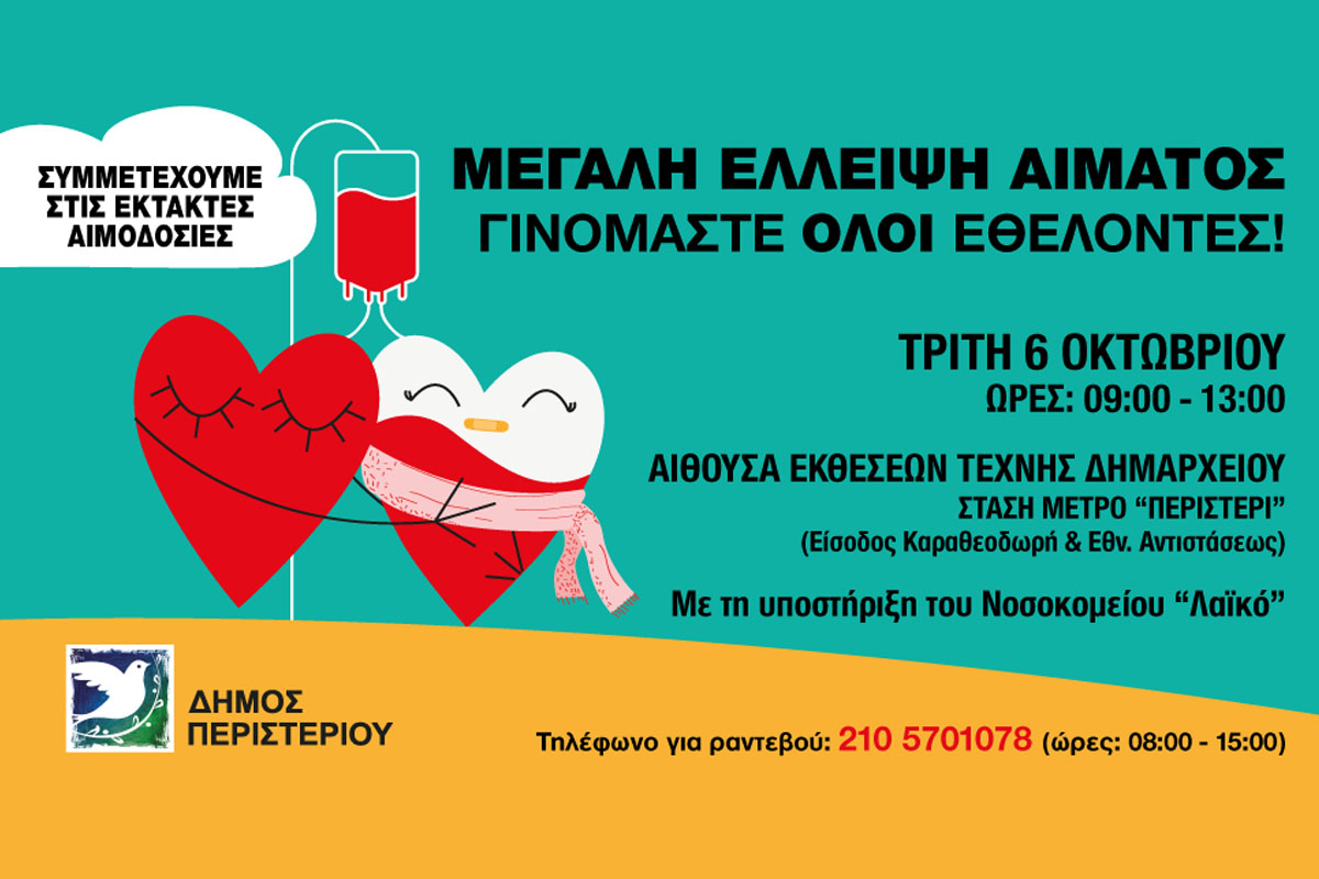 Η αιμοδοσία θα πραγματοποιηθεί την Τρίτη 6 Οκτωβρίου 2020, ώρες 9:00 – 13:00 στην αίθουσα Εκθέσεων Τέχνης του Δημαρχείου – στάση Μετρό «Περιστέρι» (είσοδος Καραθεοδωρή και Εθν. Αντιστάσεως). Κλείνετε τηλεφωνικά το προσωπικό σας ραντεβού, ώστε να μην ταλαιπωρηθείτε καθόλου (τηλ. 2105701078, ώρες 8:00-15:00).