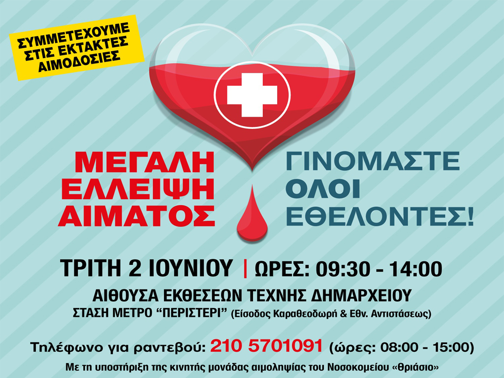 Η αιμοδοσία θα πραγματοποιηθεί τη Τρίτη 2 Ιουνίου 2020, ώρες 9:30 – 14:00 στην αίθουσα Εκθέσεων Τέχνης του Δημαρχείου – στάση Μετρό «Περιστέρι» (είσοδος Καραθεοδωρή και Εθν. Αντιστάσεως).
