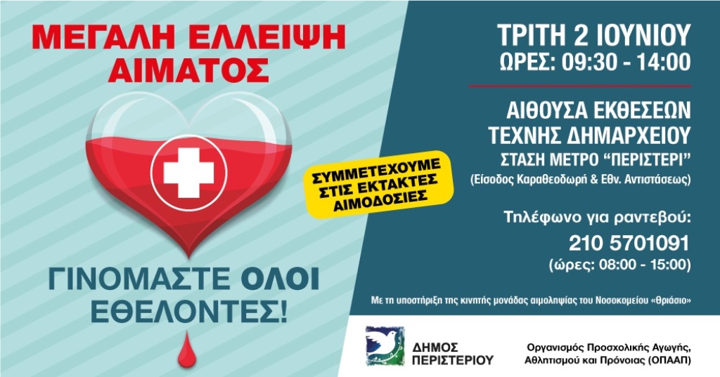 Για το λόγο αυτό ο Οργανισμός Προσχολικής Αγωγής Αθλητισμού και Πρόνοιας του Δήμου Περιστερίου (ΟΠΑΑΠ) διοργανώνει έκτακτη Εθελοντική Αιμοδοσία, με τη υποστήριξη της κινητής μονάδας αιμοληψίας του Νοσοκομείου «Θριάσιο».