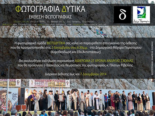 Από την 1η Δεκεμβρίου 2014 φιλοξενείται στην αίθουσα Τεχνών του Δημαρχείου Περιστερίου (είσοδος Καραθεοδωρή & Εθν.Αντιστάσεως) έκθεση φωτογραφίας των μελών της φωτογραφικής ομάδας ΦΩΤΟΔΥΤΙΚΑ με θέμα «Το ύφος μιας μέρας». Η έκθεση θα διαρκέσει μέχρι τις 7 Δεκεμβρίου.