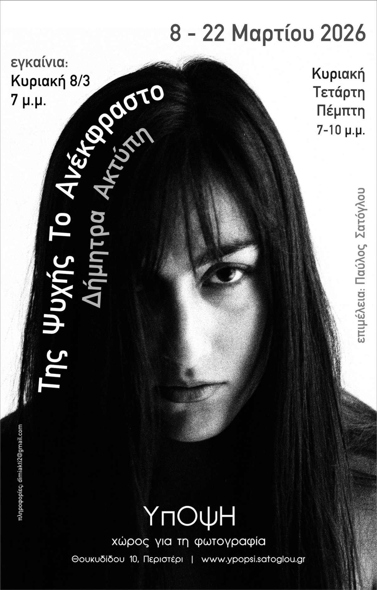 Δύο σειρές γυναικείων πορτρέτων που διερευνούν το μυστήριο της ανθρώπινης έκφρασης και το άρρητο βάθος της ψυχής παρουσιάζει η φωτογράφος Δήμητρα Ακτύπη στην ατομική της έκθεση με τίτλο «Της Ψυχής το Ανέκφραστο», η οποία εγκαινιάζεται την Κυριακή 8 Μαρτίου 2026, ανήμερα της Παγκόσμιας Ημέρας της Γυναίκας, στον χώρο για τη φωτογραφία ΥπΟψΗ στο Περιστέρι.