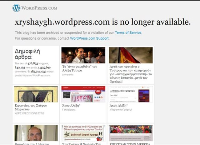 Αυτό που βλέπει κανείς όταν προσπαθεί να μπει στην επίσημη ιστοσελίδα είναι ότι έχουν παραβιαστεί οι όροι χρήσης που διέπουν το συγκεκριμένο παγκόσμιο ιστολόγιο WordPress.