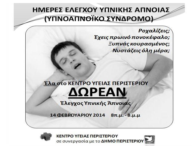 Δωρεάν έλεγχο υπνικής άπνοιας θα μπορούν να πραγματοποιούν όλοι οι πολίτες του Δήμου Περιστερίου στις 14 Φεβρουαρίου 2014 στο Κέντρο Υγείας του Δήμου (Χρήστου Λαδά 43, Μπουρνάζι).
