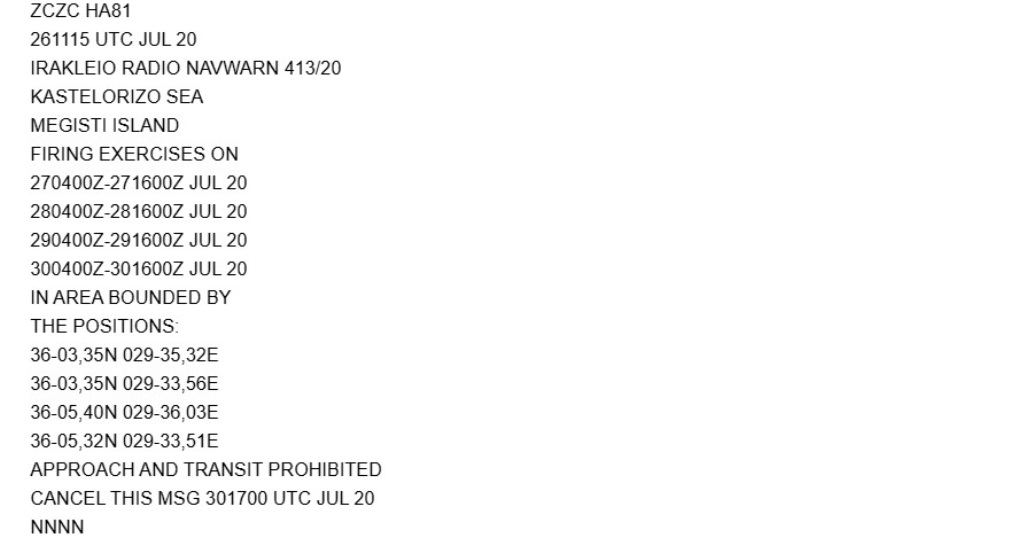 Το Αθηναϊκό – Μακεδονικό Πρακτορείο Ειδήσεων μετέδωσε το απόγευμα της Κυριακής (26.07.2020) ότι η Ελλάδα έδωσε Navtex για ασκήσεις με πραγματικά πυρά γύρω από το Καστελόριζο.