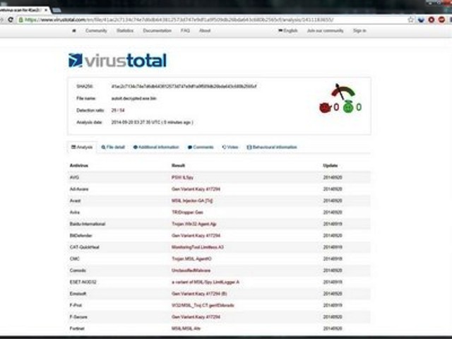 Mετά την αποκρυπτογράφηση όπως είναι εμφανές στο παρακάτω screenshot ο ιός είναι εντοπίσιμος από σχεδόν όλα τα Antivirus. Αξίζει να σημειωθεί ότι οι επίδοξοι υποκλοπείς είχαν χρησιμοποιήσει το λογισμικό αυτοματισμού AutoIT για να επιτύχουν απόκρυψη από τα Antivirus και αυτοματοποίηση σε κακόβουλες ενέργειες εν αγνοία του χρήση που τελούσε υπό παρακολούθηση.