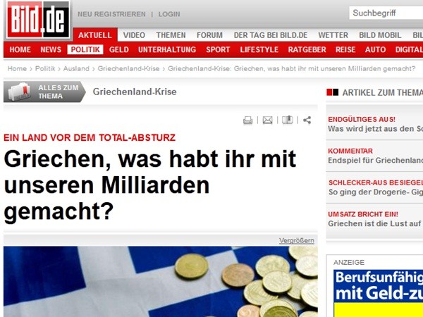 Με τον τίτλο «Έλληνες, τι κάνατε τα δισεκατομμύριά μας;» η εφημερίδα Bild προσπαθεί να εξηγήσει στην γερμανική κοινή γνώμη που πηγαίνουν τα χρήματα από τα πακέτα βοήθειας: