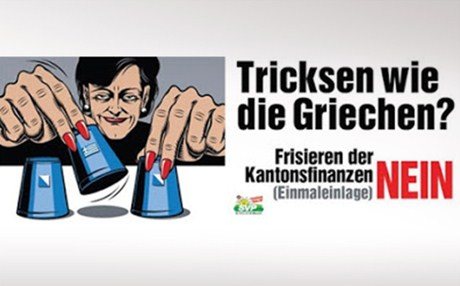 «Tricksen Sie wie die Griechen?» («Κάνετε κόλπα σαν τους Έλληνες;») αναρωτιέται στην αφίσα του το κόμμα SVP της Ελβετίας, το οποίο επέλεξε με αυτόν τον τρόπο να κεντρίσει το ενδιαφέρον των ψηφοφόρων του.