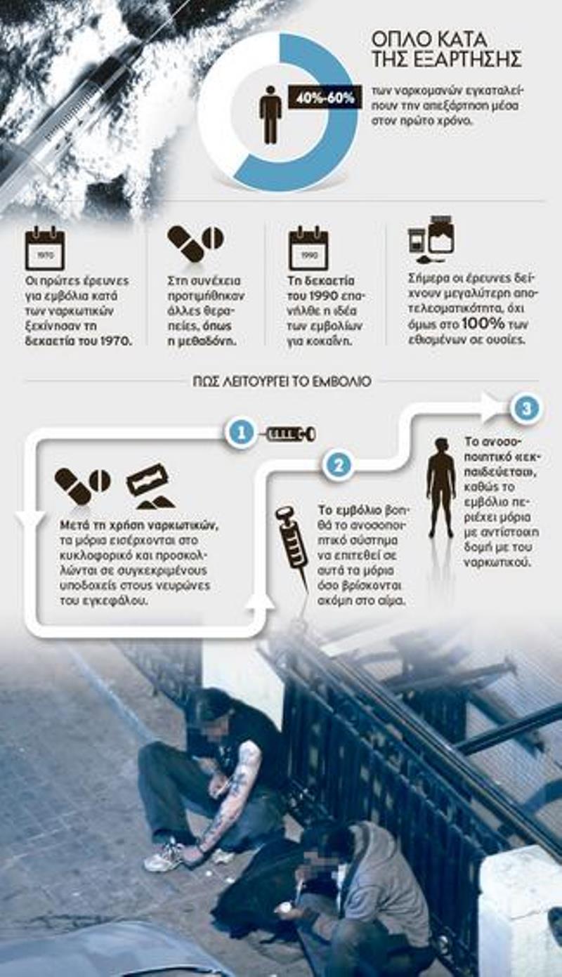Ένα εμβόλιο το οποίο θα εμπόδιζε τους ναρκομανείς να αντλήσουν απόλαυση από την ουσία που χρησιμοποιούν, θα ήταν ένα πολύτιμο όπλο στον δύσκολο δρόμο της απεξάρτησης, καθώς οι μέχρι τώρα δοκιμές δείχνουν ότι τα εμβόλια μπορούν να αυξήσουν σημαντικά το ποσοστό των ατόμων που παραμένουν στη διαδικασία της απεξάρτησης και να απαλλαγούν από τον εθισμό τους.