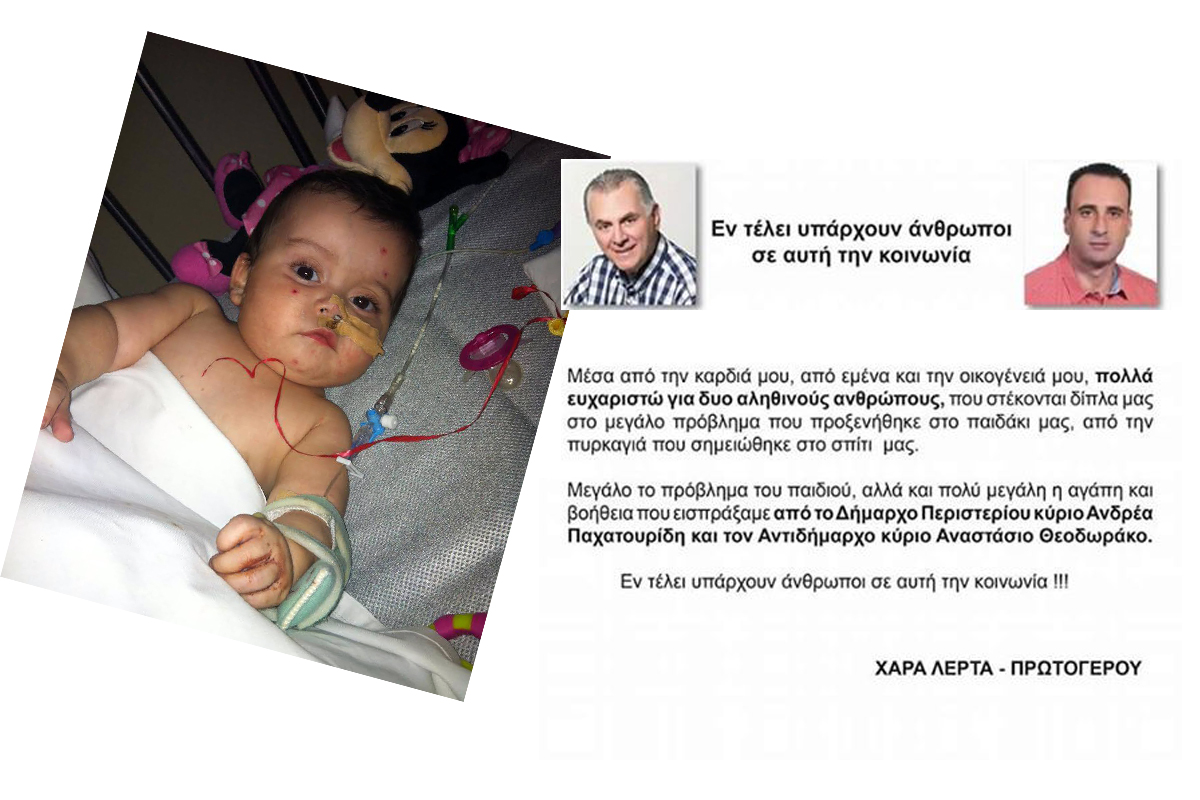Με την ατάκα «Εν τέλει υπάρχουν άνθρωποι σε αυτή την κοινωνία», η κυρία Χαρά ευχαρίστησε μέσω της σελίδας που δημιούργησε για το πρόβλημα του παιδιού της στο facebook, τους κυρίους Παχατουρίδη και Θεοδωράκο για την αγάπη και τη βοήθεια που πρόσφεραν στην Περιστεριώτικη οικογένεια.