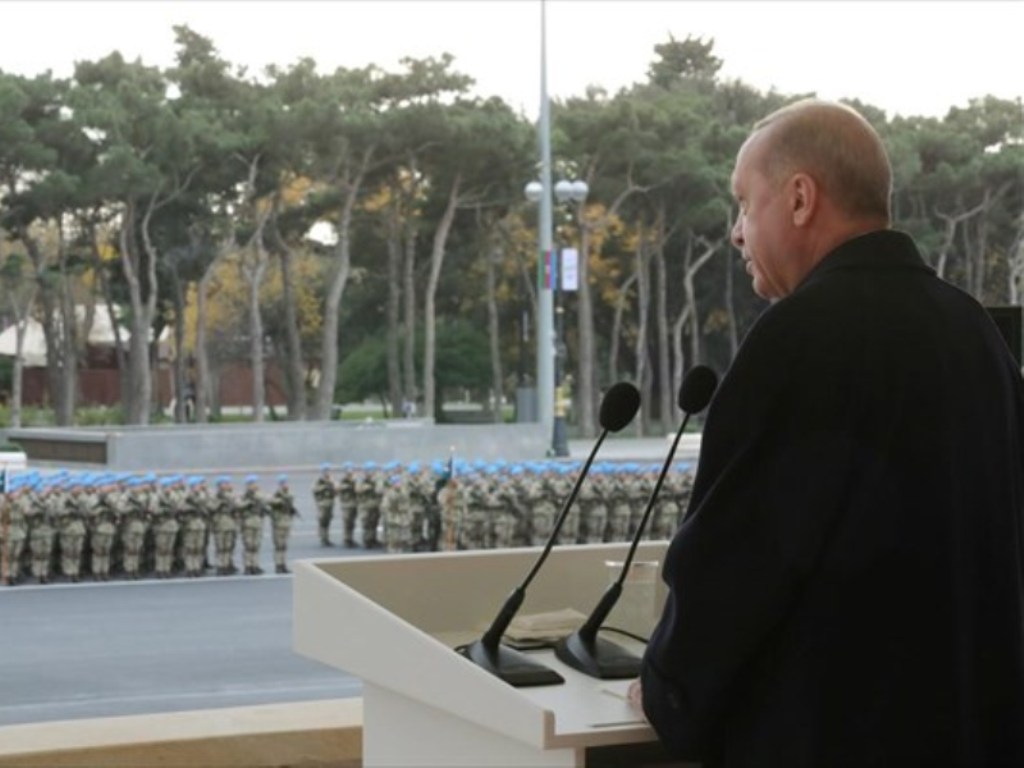 Ο Ερντογάν απευθυνόταν σε μια στρατιωτική παρέλαση για τον εορτασμό των εδαφικών κερδών του Αζερμπαϊτζάν απέναντι στην Αρμενία στη διαφιλονικούμενη περιοχή του Ναγκόρνο-Καραμπάχ.