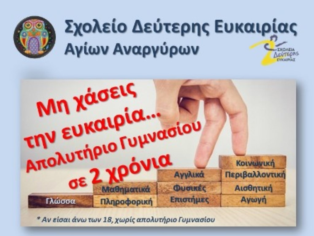 Όσοι ενδιαφέρονται να υποβάλουν αίτηση για την εγγραφή τους στον Α΄ Κύκλο Σπουδών και να ολοκληρώσουν την υποχρεωτική εκπαίδευση, αποκτώντας Απολυτήριο Γυμνασίου σε δύο έτη, μπορούν να προσέρχονται στα γραφεία του ΣΔΕ (Πίνδου Δαβάκη 20, Άγιοι Ανάργυροι) καθημερινά 5:30-8:30 μ.μ. μέχρι τις 30 Σεπτέμβρη.