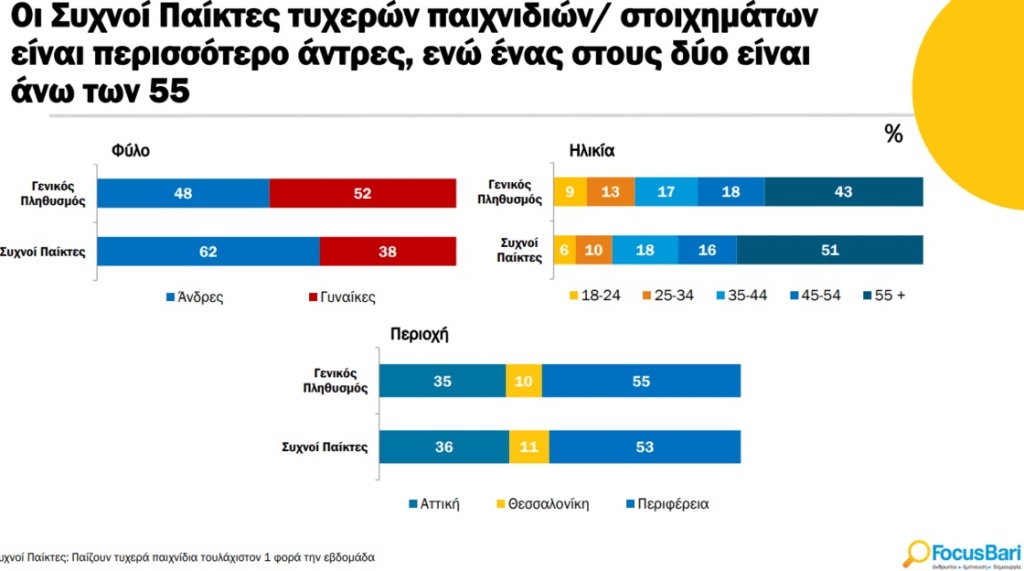 Αναφορικά με το φύλο, οι συχνοί «παίκτες» είναι περισσότερο άντρες απ’ ότι γυναίκες, και ο ένας στους δύο συχνούς βρίσκεται στις ηλικίες άνω των 55 χρόνων.